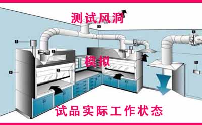 风量实验室基本原理:测试风洞中模拟产品的实际工作状态(由辅助风机使试品出风口压力与要求的一致),测出风洞中喷嘴两侧的气压差,再由标准公式计算出此时对应的风速,最后乘以喷嘴面积和相关流量系数而得出风量。